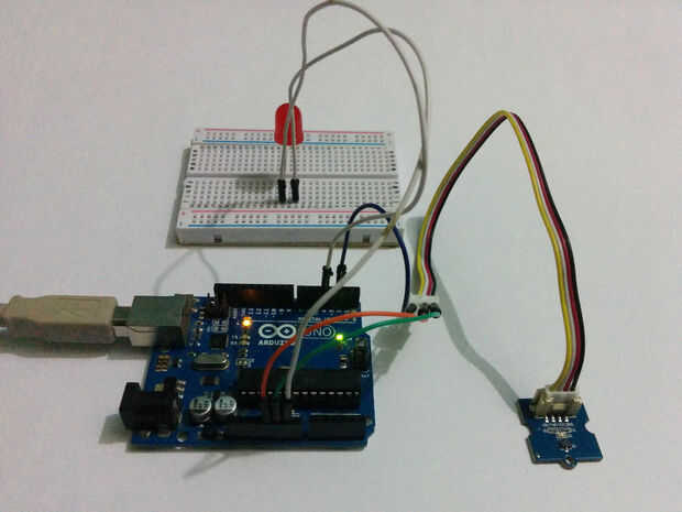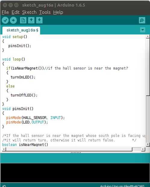 void setup() <br>{ pinsInit(); } void loop() { if(isNearMagnet())//if the hall sensor is near the magnet? { turnOnLED(); } else { turnOffLED(); } } void pinsInit() { pinMode(HALL_SENSOR, INPUT); pinMode(LED,OUTPUT); } /*If the hall sensor is near the magnet whose south pole is facing up, */ /*it will return ture, otherwise it will return false. */ boolean isNearMagnet() { int sensorValue = digitalRead(HALL_SENSOR); if(sensorValue == LOW)//if the sensor value is LOW? { return true;//yes,return ture } else { return false;//no,return false } } void turnOnLED() { digitalWrite(LED,HIGH); } void turnOffLED() { digitalWrite(LED,LOW); }