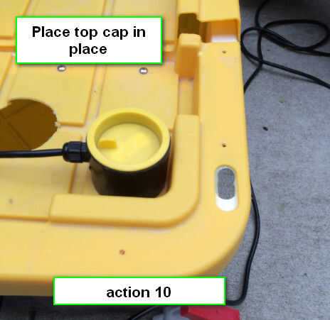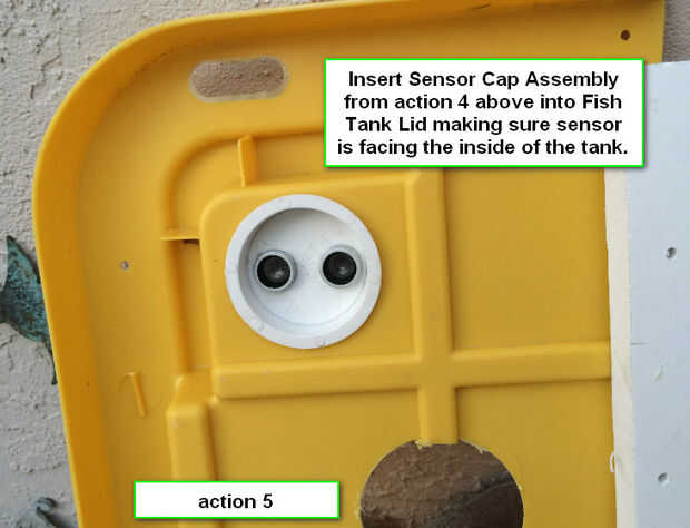 Inserte el montaje del Sensor de tapa de acción 4 arriba en la tapa del tanque de pescado asegurándose de que sensor es hacia el interior del tanque.