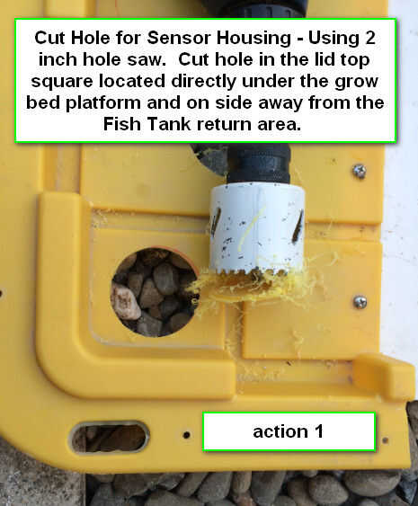 Orificio para Sensor de vivienda - con 2 pulgadas sierras. Corte un agujero en la tapa superior Plaza directamente debajo de la plataforma de la cama de crecimiento y en parte de la zona de retorno tanque de los pescados.