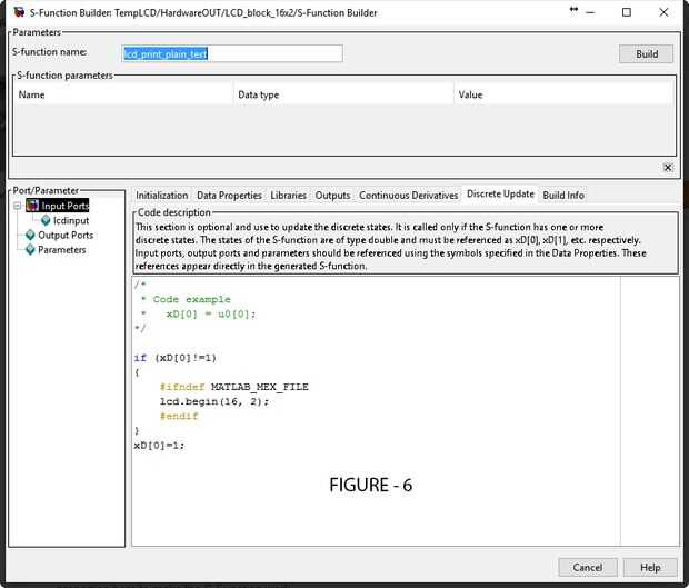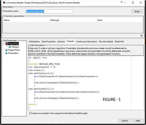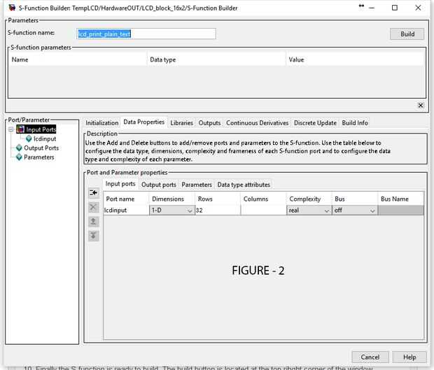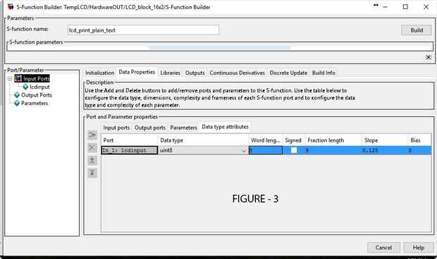 - Nuestro bloque de LCD es un bloque de salida, por lo tanto será puerto de entrada. He creado un puerto de entrada de nombre 'lcdinput' (véase figura 2). Como es una matriz de 32 caracteres, tenemos que escribir 32 en las filas. En la sub-ficha de de atributos tipo de datos, tenemos que definir el tipo de datos de nuestra variable de entrada 'lcdinput' como uint8. (Consulte la figura 3)