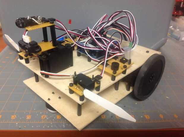 El código siguiente utiliza los sensores de este instructable para controlar un obstáculo autónomo evitando robot. Los interruptores de la hoja se utilizan para detectar contacto con objetos a la izquierda y la derecha. Si se activa un interruptor de contacto, el robot se detiene, retrocede y entonces da vuelta lejos del objeto antes de continuar. El sensor de distancia infrarrojo se utiliza para determinar la distancia a objetos delante del robot. Si un objeto está más cercano que una tolerancia de ajuste, las paradas de robot y un servo gira el sensor de IR a la derecha y hacia la izquierda para las mediciones. El robot se convierte entonces en la dirección de la más clara antes de continuar. Un botón se utiliza para iniciar el robot. Aunque técnicamente no los sensores, el láser, el zumbador y el LED se utiliza para dar retroalimentación visual y sonora de los sensores. Cuando el robot esté en movimiento, el LED verde está encendido. Cuando el robot se detiene, los sonidos del zumbador y el LED rojo se enciende. El láser se une al sensor IR dando una indicación visual de dónde apunta el sensor de distancia infrarrojo.
