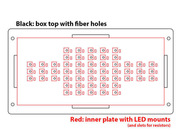 Partido la ubicación de los LEDs con los agujeros en el panel superior de la caja, con el mismo diámetro que su fibras (siempre les puede ampliar un poco luego si no encajan en las fibras). Si te fijas bien en el Neopixels, las regiones emiten luz se compensan levemente en comparación con el centro de los círculos. Para intentar maximizar la luz en las fibras, compensa realmente la ubicación de los orificios por medio milímetro.