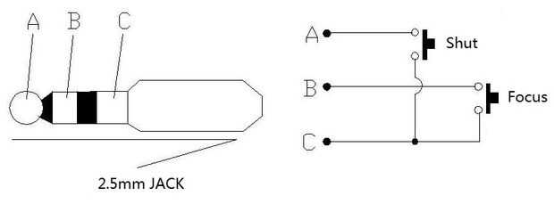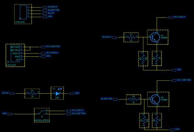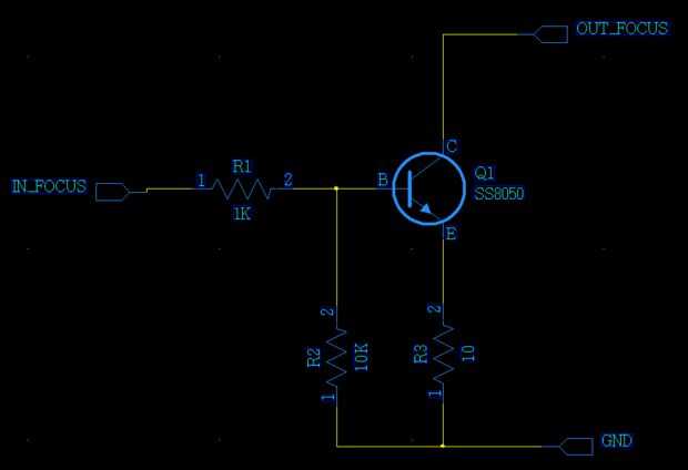 2. como se muestra en la segunda imagen, que utiliza principalmente un triodo para control. 'En_foco' se conecta al PIN digital de arduino como entrada y 'OUT_FOCUS' se conecta a la cámara como la salida. Es necesario añadir R2 para evitar algún disparo por error.
