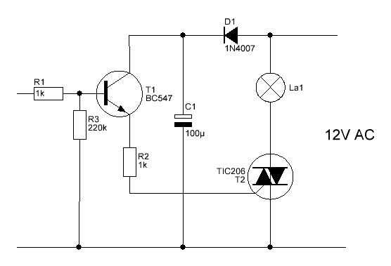 Este circuito puede utilizarse para activar una carga de AC de bajo voltaje (12V) con un Arduino u otro microcontrolador. Una señal positiva en la entrada traerá T1 en conducción, disparo el Triac a través del resistor de emisor R2. D1 y C1 son solo para proporcionar alimentación de CC para el transistor. R3 se tire bajo base. El circuito funcionará sin R3 pero podría reaccionar errático: durante la puesta en marcha de su nicrocontroller, el pin conectado al circuito podría ser indefinido y cambiar algo cuando no se desea. También, como impulsos negativos pueden desencadenar un TRIAC, cambio de alto a bajo puede desencadenar el triac si R3 no está presente.