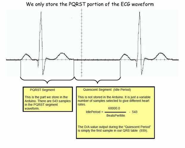El lenguaje C estructura de matriz con un inicializador sólo almacena la parte del método de la forma de onda de ECG. No se almacena la parte quieta; más bien el convertidor retendrá (hold) un único valor durante el período de reposo. Modificar el número de muestras emitidas durante el período quieto efectivamente controla el ritmo cardíaco. La cuarta figura da detalles acerca de esta característica.