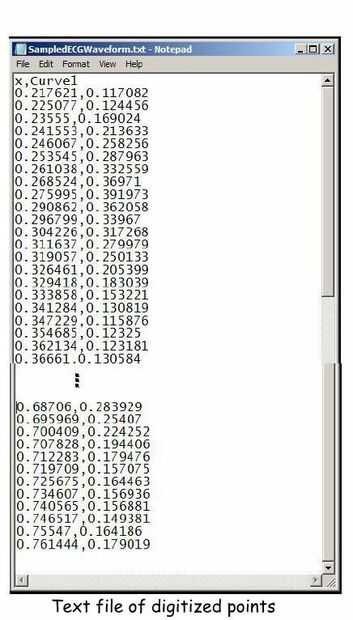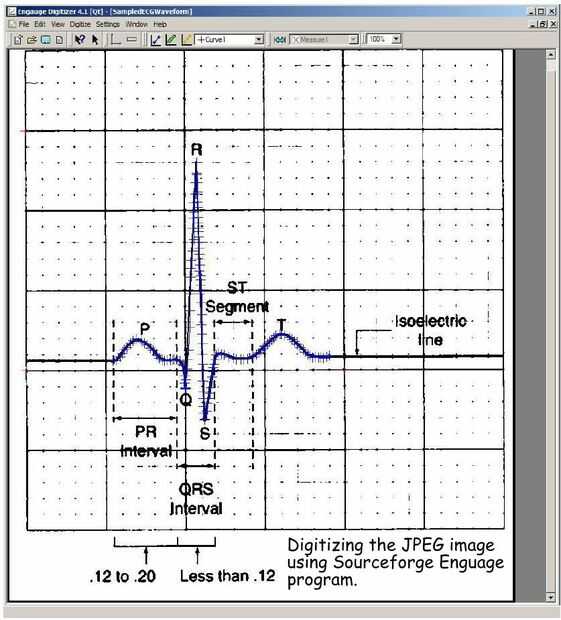 Otra cosa a saber es que la amplitud del ECG según lo medido por electrodos conectados en la piel es sólo un par de milivoltios. El siguiente paso es digitalizar la onda con el tiempo dado y ejes amplitud utilizando el programa Open Source de digitalizador Engauge.