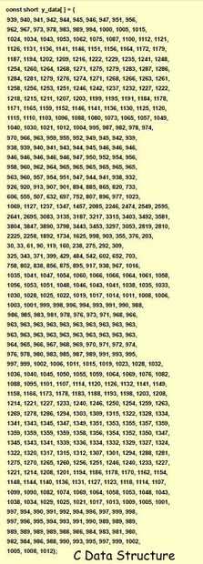 Para solucionar estos problemas y a ampliar los puntos de forma de onda a un convertidor D/a de 12 bits (0.. 4095) y el intervalo de tiempo a 1.000 milisegundos, un programa Python fue escrito para hacer estas modificaciones (interpolación lineal, clasificación y un montón de formato) y finalmente masaje los datos en una estructura de matriz C const perfectamente legal con un inicializador (véase la tercera figura más abajo). Este archivo de texto puede ser cortado y pegado en el sketch de Arduino.