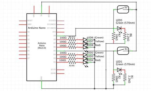 El cableado de arduino es bastante simple y se muestra en el esquema de abajo. Se conectan los componentes para el semáforo y el sensor en el St de S primer a D2-D5, terminales D5-D9 están cableados para la luz y el sensor en E segundo St.