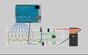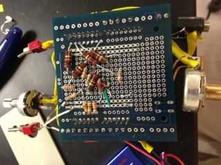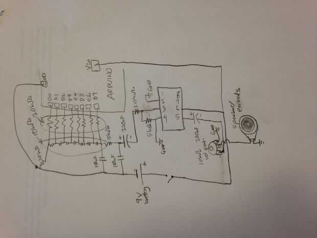 Ahora, vamos a abordar el digital al convertidor análogo (DAC), el amplificador, la salida de auriculares y la batería. Éstos están todos conectados, así que creo que su mejor a verlos todos juntos. Para entender cómo funciona, debemos mirar lo que está haciendo el código. A una frecuencia de 8000Hz, Arduino, basado en los botones que fueron presionados, toma un número entre 0 y 255, ambos inclusive y convierte a un número binario de 8 dígitos (p. ej. 182 = 10110110). Este número binario obtiene salida en 5V = 1 y 0V = 0, a los pines digitales 0-7. El DAC efectivamente resume las lecturas y establece la tensión de salida entre 0 y 5V, proporcional a 0-255. Nosotros le llamamos el "medio" voltaje 127, correspondientes a la salida de 2,5 V, que permite la fluctuación positiva y negativa. Ahora cada 1/8000 de segundo, el Arduino cambia este voltaje y este cambio de voltaje se pasa a través de paso bajo y filtros de paso alto (condensadores) para filtrar hacia fuera ruido. Por último, la forma de onda es amplificada y convertida en las vibraciones que se escuchan en las almohadillas.