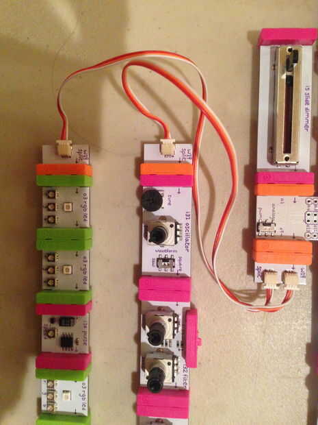 La única variable que utiliza este código fue para el fader, que controla el tono del oscilador (por alteración de la mezcla de salida de voltaje de Arduino con eso del oscilador) y el brillo de las luces. El fader venía en 1 entrada analógica, por lo que he creado la variable "PotVal" a la igualdad de "analogRead(A1)". Porque el oscilador y las luces leer una escala diferente que las salidas de fader, usé la función de "mapa" para crear un "scaledPotVal" así.