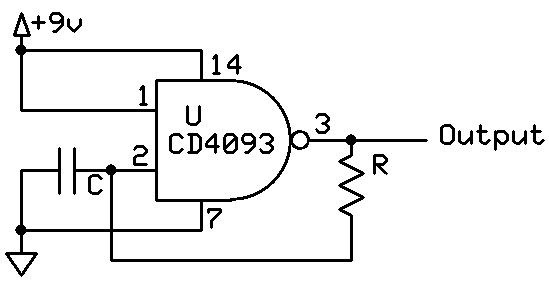 Hay algunas maneras para obtener una compuerta NAND para darle una onda cuadrada. Vamos a utilizar una forma que requiere una puerta, resistencia y condensador por oscilador: