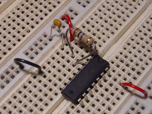 Si observas la salida de esta puerta en un osciloscopio/escuchar y encienda los valores de condensador y resistor, usted notará que puede aproximar la frecuencia de la onda cuadrada por f = (1 / (r x c)). Por ejemplo, cuando c = 470 pf y r = 10 megaohms, f = 212 Hz (medida en 250 Hz). Aquí es donde los números números de máxima resistencia muy útiles para conseguir una idea de qué tipo de valor de la capacitancia para elegir.