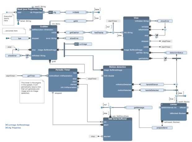 La imagen se pasa al bloque de Detección de movimiento que realiza la detección de imagen real. El bloque de detección de movimiento también utiliza OpenIMAJ. Un método dentro de este bloque compara dos imágenes y se de cambios en la imagen la bandera cuando se detecta movimiento. El método es muy CPU intensivo y tiene que ejecutarse en un subproceso independiente. Cuando se detecta una imagen que se señala en el pin de motionDetected que se activará la generación de un mensaje SMS.