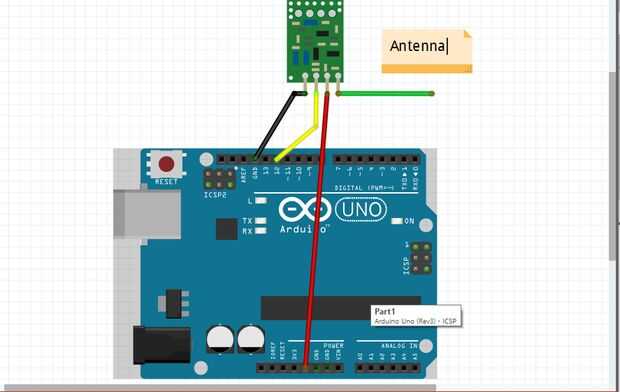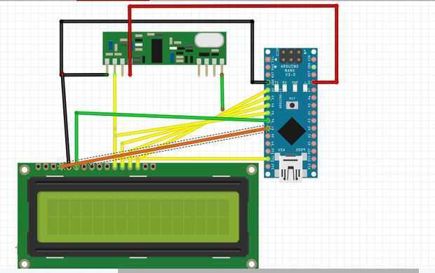 El módulo Rx está conectado al Arduino Mini. También tiene 4 pins (algunos módulos tienen 2 datos y 3 pines de gnd) ignoran. El pin de datos está conectado al pin D11 de Mini. VCC y Gnd se conectan al + 5V y gnd respectivamente. La antena es un largo cable 10-12cm.