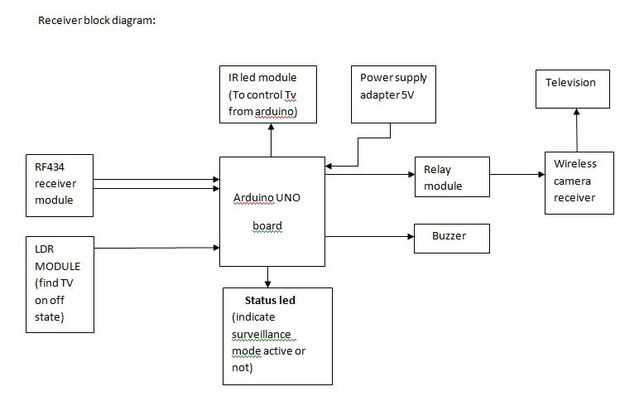 El módulo de receptor sin hilos de la cámara se utiliza para recibir la señal inalámbrica de la cámara en la sección de transmisor de este proyecto. es alimentado por adaptador de 9v. suministro de adoptante que a través del módulo de relé receptor de la cámara. y salida de receptor de la cámara está conectada con puerto AV3 de la TV usando el cable AV. La conexión de dth TV para ver canales de TV está conectada en el puerto AV2 de la TV. (Si su TV tiene solamente dos puertos AV que es como AV1 y AV2, luego conectan la TV DTH configuración conexión a receptor AV1 y cámara sin hilos al AV2 del canal Puerto del televisor )