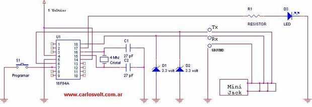 Si el id está activo, nos aparecerá la leyenda + CLIP: "Numero de telefono", 129, "",,"Carlosvolt", 0 donde "Número de telefono" nos mostrará el número del celular que está llamando y en el ejmplo "Carlosvolt" es el contacto asociado a ese número. Bien con esto ya tenemos una idea de como se activa el identificador de llamadas con comndos en recordar por más que lo tengasmos activo en el teléfono este sólo se activa de esta manera para poder visualizarlo por el hiperterminal y si se apaga el teléfono esta configuración se pierde. El código fuente del proyecto Este código basicamante lo hace es programar al celular para envíe la información del identificador de llamadas anteriormente explicada, en primera intancia envía el comando a para establecer un vinculo con el teléfono, luego envía el comando AT + CLIP = 1 para habilitar el id de llamados. Nota importante: Si se apago el teléfono, encenderlo esparar una que ya este todo disponible, luego apretar el pulsador para el microcontrolador lo vuelva reprogramar, luego esperar unos segundos, tambien reprograma automaticamante si se apaga y enciende el circuito nuevamante. Luego el pic entra en un siclo de análisis en el cual busca si aparece la cadena c1 es así como debemos llamar al contacto o los contactos queremos autorizar párrafo situado o apagar el led, esto es ideal ya no habrá reprogramar el microcontrolar para autorizar un número o desautorizarlo, simplemente se cambia el nombre del contacto o se borra el mismo , y con eso será suficiente. Este proyecto es ideal para sistemas de seguridad, como por ejemplo una alarma, donde podemos activar o desactivar la misma en forma remota y pecado generar ningún gasto Opencrom. Les adjunto el código fuente del mismo donde esta detallado en bloques más o menos hace el mismo y el archivo. HEXAGONAL, es importante saber el fusible del perro guardián debe estar "desactivado", igualmente necesitará en el código fuente este fusible de programación esta apagado.