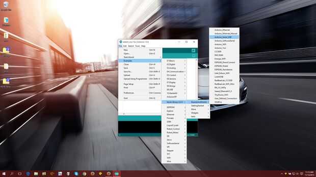 Vaya a archivo → ejemplos → blynk-biblioteca-0.3.0 → BoardsAndShields y haga clic en Arduino_Serial_USB (Foto 2). Debe aparecer una nueva ventana. Seleccione todo el texto en el ejemplo y copiar a la ventana original de Arduino y entonces cerrar el ejemplo. Vaya a archivo → guardar como... y guarde su dibujo en algún lugar conveniente. Llamé a mi proyecto de la cámara de WiFi.