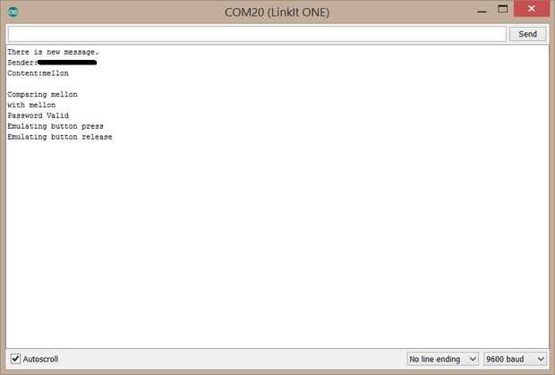 #include <LGSM.h> //these variables are used for the LED int ledGreenPin = 13; //I am using the onboard LED as an indicator boolean ledGreenState = LOW; //this is the pin that is connected to the transistor base (via a resistor) int triggerPin = 12; //these variables are for the sms char smsContent[200]; int smsLength = 0; char smsSender[20]; //these variables are for the password const int passwordLength = 20; //number of possible characters in password, remember the null terminator const char password[passwordLength] = "mellon"; //this is the actual password