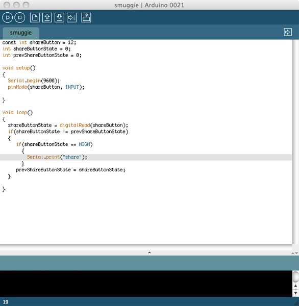 Abrir 2) Arduino. El código a continuación básicamente va a programar en nuestro Arduino a esperar a que una prensa del botón y envíe un mensaje a procesar cada vez que se pulsa el botón. Copie el código en la ventana de Arduino y conectar tu Arduino al ordenador. Haga clic en el botón de subir en la parte superior de la ventana. Verás un mensaje en la parte inferior de la ventana que dice "Done" una vez que todo haya terminado. Ahora está todo listo para la codificación de nuestro Arduino.