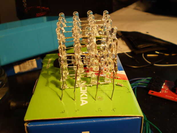 Colocando las resistencias en la parte posterior, sólo necesitamos 4 porque los 4 'carriles' siempre se utilizan cuando ninguno de los LEDs del cubo está encendido...