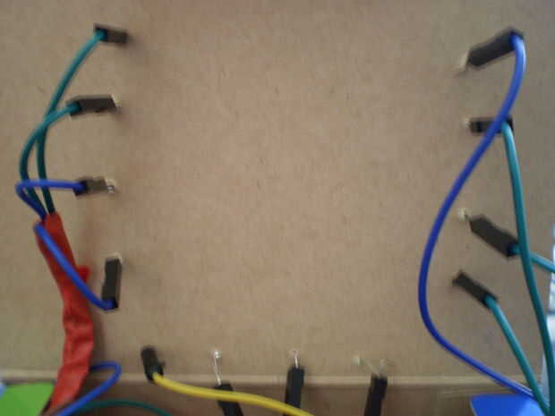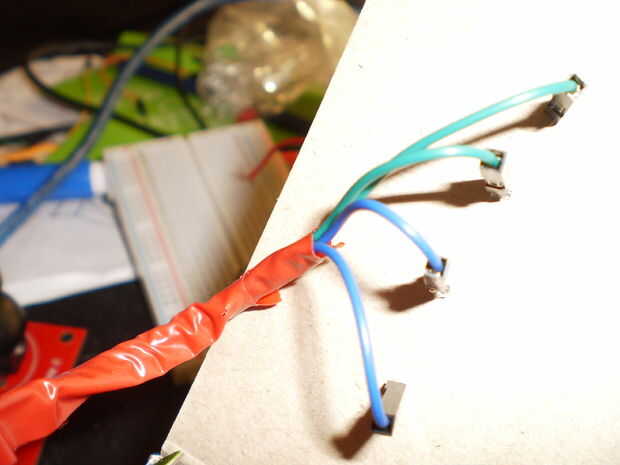 En el interior de la caja de cartón utilicé los cables de jumper hembra-hembra donde poner las conexiones en. Tuve que doblar las piernas de resistencia porque de lo contrario caería en el puente de alambre demasiado fácilmente. El beneficio de trabajar con los cables de puente es que todo puede desmontarse fácilmente para la fijación o reutilizar más adelante. Pero si usted utiliza cables de puente, asegúrese de no deshagan demasiado fácilmente! Luego poner un cable puente macho en el otro lado de cada alambre jumper hembra-hembra y había conectado a los puertos correctos de Arduino. Nota que puede utilizar cables de jumper hembra-macho en lugar de lo que hice en dos pasos, si tienes algunas de las personas. Yo también grabó algunos de los cables de jumper hembra-hembra juntos cuatro por cuatro para limpiar algunos de lo desorden en la cartulina.