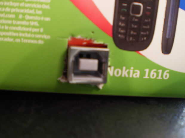 Como utilicé una caja de cartón era fácil hacer algunos orificios para las conexiones entrar. Primero encontrar un lugar suiteable para tu Arduino (una esquina) y hacer un agujero en su caja para la conexión USB. También puede hacer un agujero para la potencia de conexión del enchufe si usted prefiere. Decidió no utilizarlo y así no (todavía) hacer un agujero en este momento. Si el agujero es en lugar tratar de conectar tu Arduino lo mejor posible. Utilicé algunas cintas pero estoy seguro de que usted puede subir con las soluciones de la mejor y más limpia;).