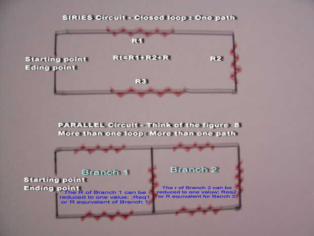 IN URL::: Usando la analogía de la pipa de agua, creo que de tubos conectados entre sí en la forma de la figura e-i-g-h-t::: de cualquiera dado el punto de partida hay más de una ruta de acceso o rama en la que el agua puede fluir. El secreto para tratar con circuitos paralelos es aislar cada rama y utilizar las normas de la serie descritas más arriba para encontrar una resistencia equivalente para cada rama (Req1 y Req2 en este caso). Esto en efecto reduce el circuito a dos resistencias (Req1 y Req2) en serie. Como con los circuitos de la serie, la resistencia TOTAL es la suma de las resistencias individuales - Rpt = + Req2 Req1 en este caso.