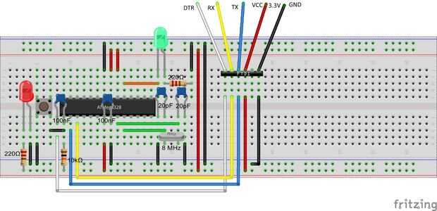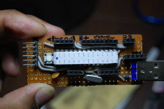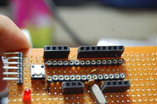 Primero soldar todos los componentes pasivos, como los zócalos, encabezados, botones, resistencias, condensadores y thecrystal. Yo he soldado no el ATmega328 directamente a la placa, pero en lugar de otro soldado en 2 tiras de zócalo de FPT en el que podrá colocar el microcontrolador. Esto hace fácil para que me suelde sin preocuparse por freír mi chip. Puede soldar los componentes en cualquier arreglo te gusta, pero si quieres hacerlo de la manera fácil, siga estos pasos: