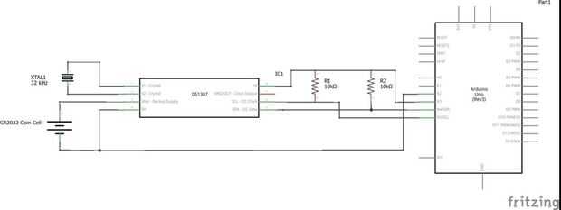 El RTC (reloj en tiempo Real) es, en palabras simples, el cronometrador. He utilizado un DS1307 IC como la RTC. Se utiliza un cristal de 32,768 khz para mantener con precisión el tiempo y se comunica con el Arduino usando I2C. El DS1307 necesita una batería de 3v a tiempo cuando no suministra 5v. He utilizado una celda de moneda para tal fin y este utiliza chip poco tal potencia que la celda tendrá una duración de 8 años!