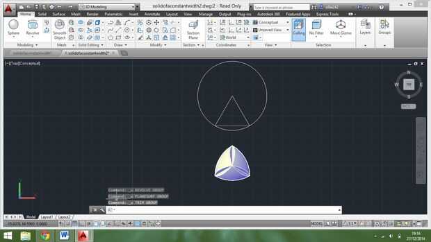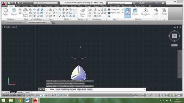 El borde de recambio es un sólido de revolución de un segmento de un círculo cuyo radio es de la misma longitud que uno de los bordes del tetraedro. Para hacer esto sólo hacer otro triángulo y hacer un círculo. Usaremos el comando trim para obtener sólo el segmento y luego convertirá en una superficie. Después de utilizamos el comando revolve para hacer el objeto.