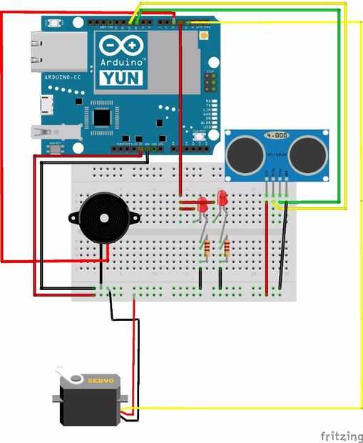 Programar el Arduino para ejecutar ciertos comandos si el sensor de distancia mide un objeto sólido dentro de 50 centímetros de sí mismo. Dentro de los 50 centímetros más cerca el objeto sólido consigue el sensor más el servo moverá el dedo arriba y llega a ser más alto el tono producido por el zumbador piezo. También he añadido que si se mide una distancia de 50 centímetros dos luces del LED se enciende.