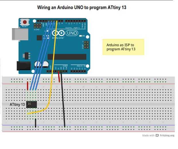 Me voy a los detalles aquí acerca de cómo configurar Arduino UNO como ISP y donde conseguir las bibliotecas ATtiny 13. Después de algunas investigaciones encontré este excelente video de Chris Stubbs sobre cómo hacerlo. El vídeo también muestra cómo conectar Arduino UNO y ATtiny 13 juntos.