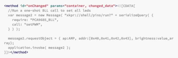 El método onChanged ejecuta una llamada BLL paso a paso para configurar todos los LEDs según los valores de elementos almacenados en el value_array. 0 x 40, 0 x 41, 0x42 y 0x43 son las direcciones de los desbloqueos PWM encadenados. La función setPWM en la biblioteca BLL utiliza comunicación I2C para actualizar registros en los brotes con el fin de cambiar la salida y controlar el brillo de los LEDs.