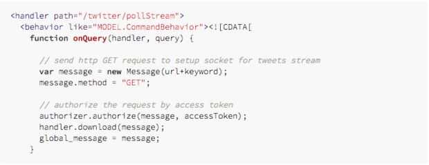 Para el flujo de tweets de la encuesta, se utiliza el método de handler.download() para configurar un socket. Cada vez que recibe la información del tweet, los datos se pasarán como pedazos al método onReceive(). Las solicitudes HTTP son autorizados por el accessTocken duro código como variables.