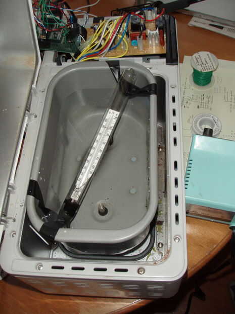 En primer lugar, vamos a hablar usando el sensor de temperatura. Usted debe conseguir algunos números del circuito del termistor cuando usted revise las entradas de A/D que le asigna, que por supuesto no es grados f el. Así que tenemos que calibrar el circuito del sensor. Una manera rápida y sucia para hacer esto es llenar la asadera con agua caliente a unos 160 grados F, ponga un termómetro en él y lo deje reposar en la máquina de pan con la tapa cerrada hasta que el termómetro llegue a unos 140. Te tiene que utilizar la ventana o conjetura y verificación, pero intentar comprobar sólo una vez o dos veces. Cuando el termómetro muestre unos 140, utilice su programa para leer el A/D entrada y considerar temporalmente este número corresponde a 140 grados. Realmente sería más parecido a 120-130 grados, pero lo arreglaremos esto más adelante. Además de esto, es necesario confirmar si el valor de A/D es mayor o menor medida que la temperatura aumenta. Estos dos pedazos de información son suficientes para empezar a hacer control de retroalimentación de la temperatura.