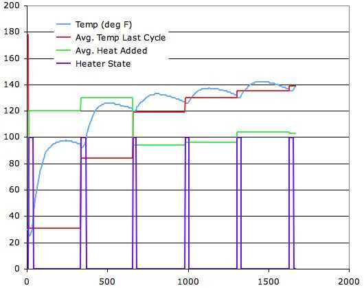 Después de algunos experimentos, he podido obtener el rendimiento que se muestra a continuación de mi controlador PI. Ahora estoy listo para hacer una calibración de temperatura más precisa: puedo ajuste el regulador de respuesta a una consigna específica basada en el valor de A/D de termistor, llene la bandeja para hornear parcialmente con agua y suspenda un termómetro en él y esperar hasta que el controlador llegue a estado constante (cero error para al menos 2 ciclos). Ahora sé que este valor del termistor particular corresponde a una temperatura particular. Si lo hago dos veces o, mejor aún tres veces, puedo trazarles y trazar una línea que me da mi ecuación de conversión! Tenga en cuenta que el termistor no estar terriblemente lineal sobre un rango amplio de temperaturas, énfasis en asegurarse de que su curva de ajuste coincida con tus datos exactamente en el punto de ajuste deseado. Algunos errores en otras temperaturas están bien, funcionará el controlador de la retroalimentación.
