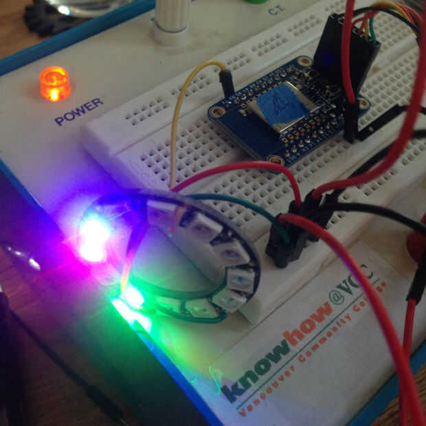 La configuración inicializa la biblioteca de NeoPixel, el fondo basa en el reloj, intenta conectarse a la red local y comienza al cliente UDP . La espera para conectarse a la red Local, el anillo de NeoPixel cambia a colores al azar cada pocos segundos.
