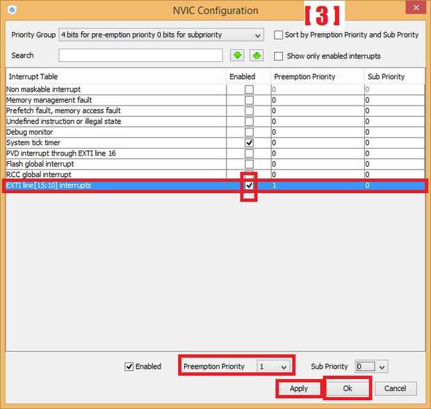 Ahora cambie a la ficha de configuración pulsando el botón 'configuración'. Bajo sistema, haga clic en "". Seleccione la línea de "Interrupciones de línea [15:10] nacional" haga clic en la casilla "Activado". Establecer prioridad de preferencia 1. Haga clic en "Aplicar" y clic "OK".