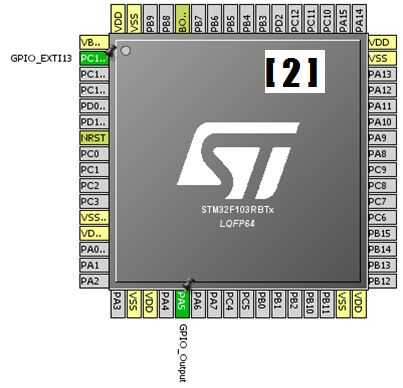Ahora, ese "botón azul" en el Consejo de núcleo, que utilizaremos como entrada de interrupción, es conectado al Pin de PC13 del microcontrolador. Ahora seleccione 'PC13' en el microcontrolador que se muestra en STM32CubeMx Software y seleccione 'GPIO_EXTI13'. Usando este botón, se alternará el LED en nuestra Junta de núcleo que está conectada a 'PE5' pin del microcontrolador. Por lo tanto, ahora seleccione 'PE5' en el microcontrolador que se muestra en STM32CubeMx Software y seleccione 'GPIO_Output'. Después de esto el microcontrolador debe tener este aspecto:
