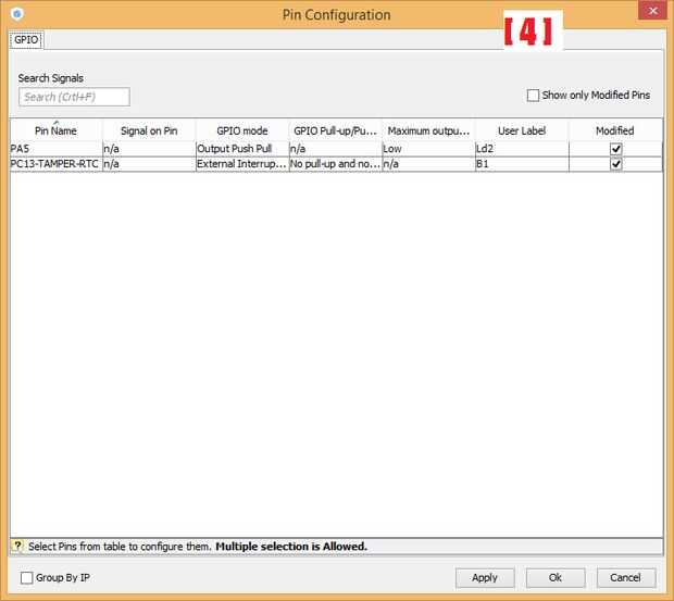 Ahora en sistema haga clic en "GPIO". Seleccione 'PE5' Pin, en la etiqueta de usuario escriba "Ld2". Después de este pin 'PC13' select y en la etiqueta de usuario escriba 'B1'. Para que esta ventana ahora se verá así. Haga clic en "Aplicar" y haga clic en "Aceptar".