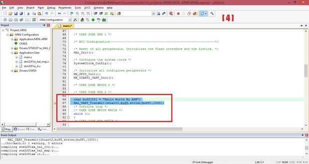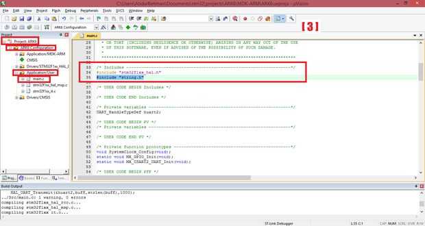 Una vez que el proyecto es abierto en Keil, abrir main.c ubicado bajo la carpeta de usuario/aplicación, ubicado en ' ' en ' proyecto: '. Desplácese hacia abajo hasta encontrar ' #include "stm32f1xx_hal.h". Después de esto añadir los siguientes línea de código: