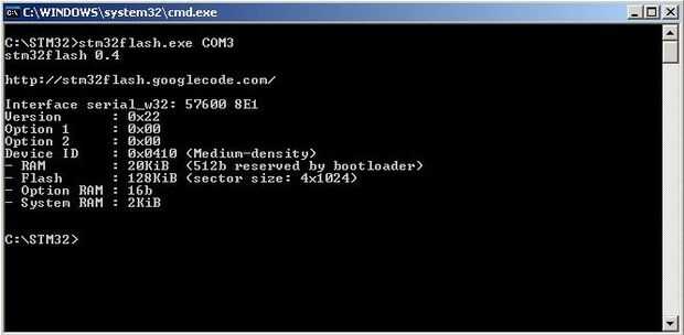 Ya que mi intención era hacer esta placa funciona en el IDE de Arduino, opté por usar una aplicación de código abierto stm32flash de https://code.google.com/p/stm32flash/ . Es la misma herramienta utilizada por proyecto Arduino STM32 desde aquí: https://github.com/rogerclarkmelbourne/Arduino_ST...