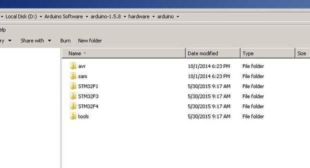 Para hacer obra en la Arduino IDE 1.5.8 elegir proyecto Aduino STM32 que encontré en GitHub en el siguiente enlace:https://github.com/rogerclarkmelbourne/Arduino_STM32. Tengo no probado con versiones > 1.6. x , puesto que estas versiones son muy nuevas y todavía no he acomodado con sus particularidades.