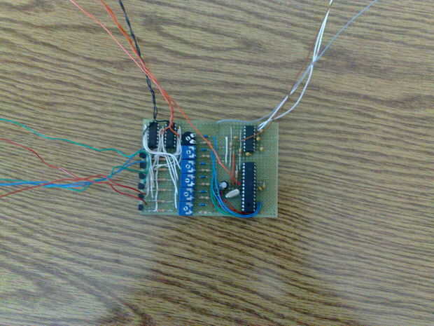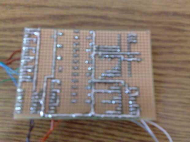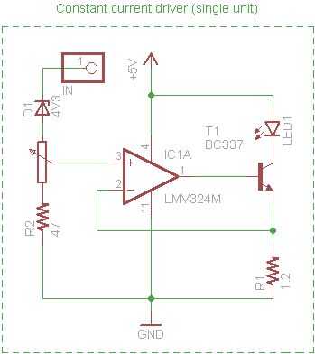 El opamp cambia la tensión de salida hasta que la diferencia entre + y - es 0. Si atribuimos el - entre el emisor y la resistencia de la caída de tensión en el resistor entrará-. Todos tenemos que hacer es traer + queremos a la caída de tensión en el resistor y el opamp ajusta la salida para dar esta caída. Por ejemplo, si la resistencia es de 1,2 ohmios y ponemos 0.36V el + de entrada la caída en la resistencia será 0.36V y la actual corriente 300mA. Le puse un Diodo zener ya que sería poco práctico regular a 5v hasta 0.3V - 0.4 v utilizando un divisor de tensión. El Diodo zener 4.3V las gotas y el condensador de ajuste es mucho más preciso. El resistor de 47 ohmios está allí sólo para limitar la corriente a 15mA en caso de un condensador de ajuste completamente dado vuelta. Necesita un conductor para cada LED. El principal problema de los LED de Dealextreme es que son ánodo común, por lo que no es posible ponerlos en serie. Así que necesito 6 conductores (2 rojo, 2 verde y 2 azules). La salida del microcontrolador se va a "In". Utilicé dos LM324 (opamp cuádruple) para tener 8 opamps (2). El transistor es BC337 (pero usted puede cambiarlo). Si utilizas BC337 no necesita caja si la disipación de la energía total es menor que 620mW. Con un 3, 5V llevó este medio 410mA corriente máxima sin caja. Si puedes, disipador de calor de todos modos.