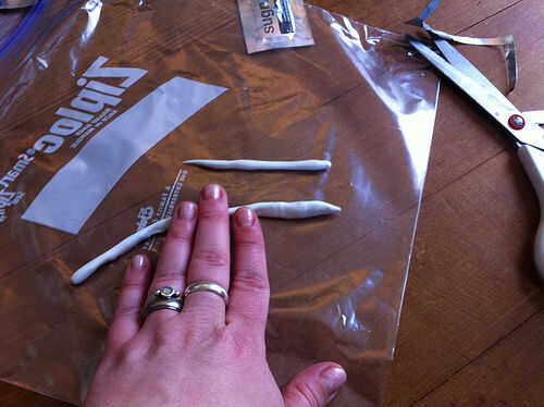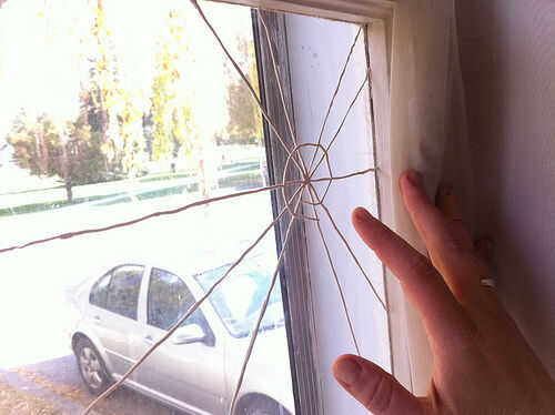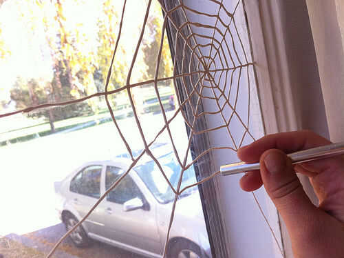 Comience en el centro de la web cerca de donde se intersecan todos los rayos. Introduzca suavemente el extremo de la cuerda larga de Sugru blanco en uno de los radios para mantener en su lugar. Lo alrededor y alrededor, trabajando hacia el exterior espiral con cuidado. Presione el Sugru suavemente contra el vidrio y las cuerdas previamente establecidas de Sugru.