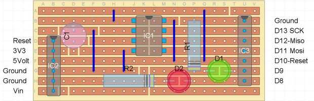 El ISP de Arduino ofrece 3 LEDs para hacer un seguimiento de estado. He implementado 2: el latido del corazón y el Error (D9 y D8). Agregando el LED 'Programación' es un poco más de una molestia ya que necesita D7 que es justo al otro lado de la brecha no normalizada en las cabeceras de Arduino, pero si lo desea puede añadir un pin ligeramente curva a ranura en D7.