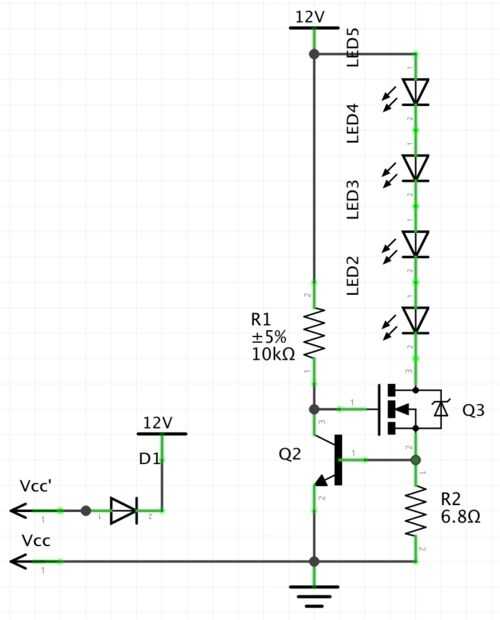 por pieza. 4 de las personas debe ser un buen reemplazo para una bombilla de halógeno de 20 vatios. La variante simple sería utilizar un resistor para quemar exceso de tensión por lo que sería la corriente por el LED en el rango de operación normal. Está bastante bien con lámparas de pequeña señal, pero para mayor rendimiento LEDs esto resultaría en calefacciones resistor minúsculo (y así no muy diferente a los bulbos de halógeno). En su lugar utilicé un circuito limitador actual que es muy sencillo. Sólo Google "corriente límite circuito mosfet" y encontrarás algunas explicaciones. Básicamente la resistencia de 6,8 ohmios a nivel 0,6 voltios y abrir el transistor dejó 86 paso mA (un poco menos de la corriente de operación de los LEDs).