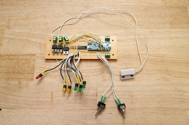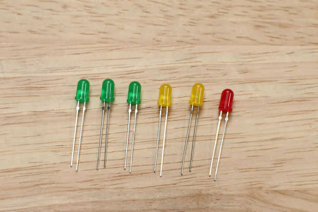 Soldar los LEDs restantes, interruptores y cables de puente a la Junta. Consulte el diagrama en el paso anterior para las conexiones.
