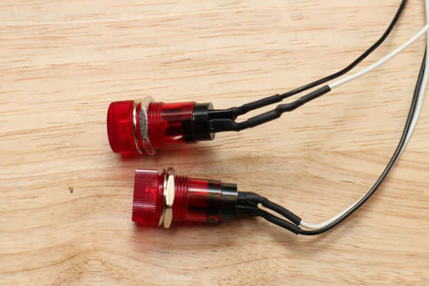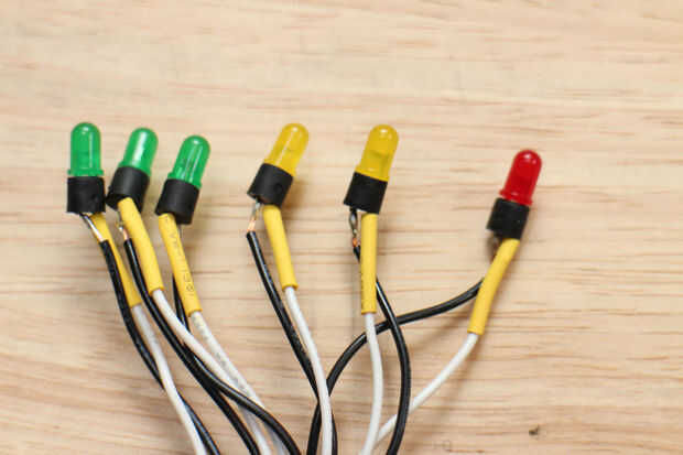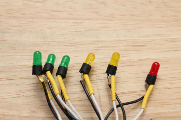 Tomar los LEDs y deslice en los tapones de goma. Soldadura de algunas pulgadas de alambre a cada uno.