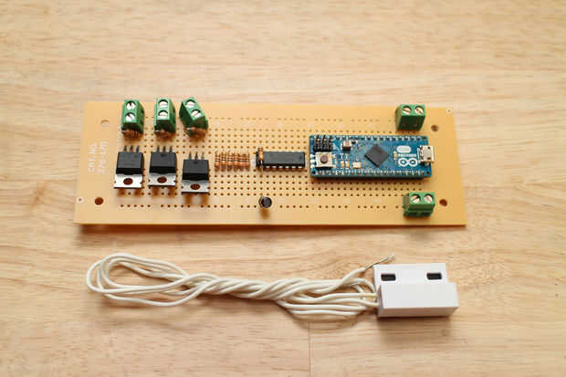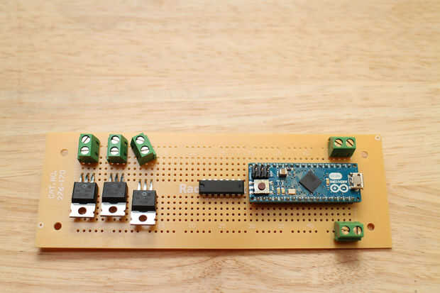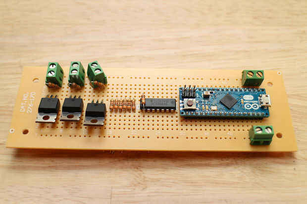 Asegúrese de que cada conexión está correctamente alimentado y conectado a tierra. El 74HC14 es alimentado por los 5V en un pin del Arduino, pero el Arduino es alimentado directamente desde la línea de 12V por medio de su pin de VIN.